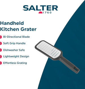 Grate with ease using the Salter Expert Grater, designed to handle cheese, vegetables, citrus and more. The sharp bi-directional stainless-steel blade works quickly & efficiently in both directions, saving time while giving you perfectly grated results. With a comfortable soft grip handle for added control, this handheld grater is durable, easy to use and dishwasher safe for fuss-free cleaning. A must-have kitchen tool for everyday cooking and food prep.