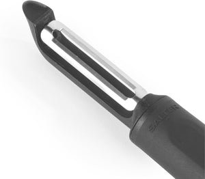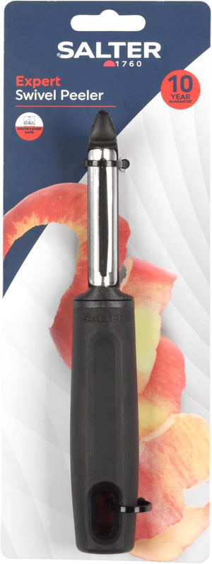 Peel every curve using the Salter Expert Swivel Peeler. Its sharp stainless-steel blade swivels to follow every curve, making peeling potatoes, carrots, apples & more, quicker and easier. The integrated potato eyer tackles imperfections with precision, while the ergonomic soft-grip handle ensures comfort and control. Durable, handheld, and dishwasher safe, this versatile kitchen tool is perfect for everyday cooking and food prep.