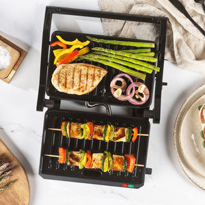 - 180° COOKING PLATES: Double your cooking using the 180° cooking plates, which conveniently folds flat, offering dual cooking surfaces so you can cater for the entire family.