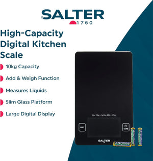 Salter High-Capacity Kitchen Scale – 10kg Capacity, Large Digital Display, Add & Weigh Zero Function, Measures Liquids, Slim Glass Platform, Food Scale, Electronic Cooking/Baking Scale
