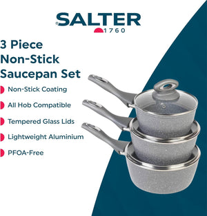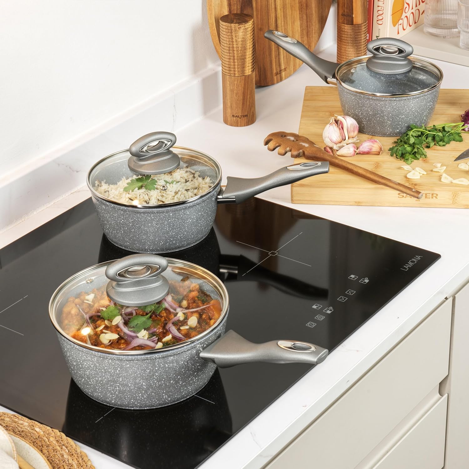 Salter Marblestone 3 Piece Saucepan Set – 16cm, 18cm, 20cm Pans, Non-Stick, Tempered Glass Lids, PFOA-Free, Corrosion Resistant Forged Aluminium, Suitable for All Hobs, Dishwasher Safe