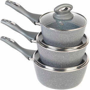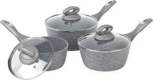 Want to cook healthier without compromising on flavours? Cook with Salter Marblestone! This 3-piece pan set includes a 16cm, 18cm and 20cm saucepan featuring a non-stick, grey marble effect. Made from PFOA-free forged aluminium, each pan includes a tempered glass lid to lock in essential nutrients! Suitable for all hob types including gas, electric and induction, this saucepan set has a soft touch and stay-cool handle offering a comfortable grip! Pop into the dishwasher to clean as good as new!