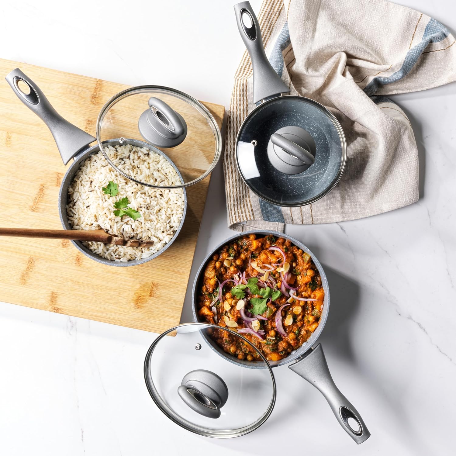 - TEMPERED GLASS LIDS: Each saucepan includes a tempered glass lid with a built-in steam vent, an easy way to lock in essential nutrients. Ensuring comfort, the set has soft touch handles that stay cool as you cook even when the heat is high.