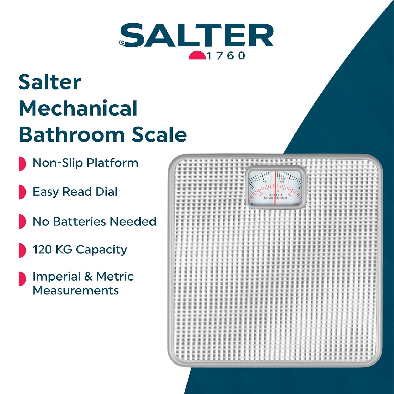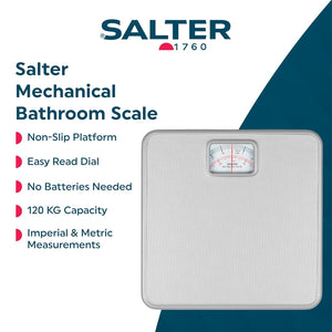 - MECHANICAL BATHROOM SCALE: The useful Mechanical Scale from Salter features imperial and metric measurement readings up to 120 kg!