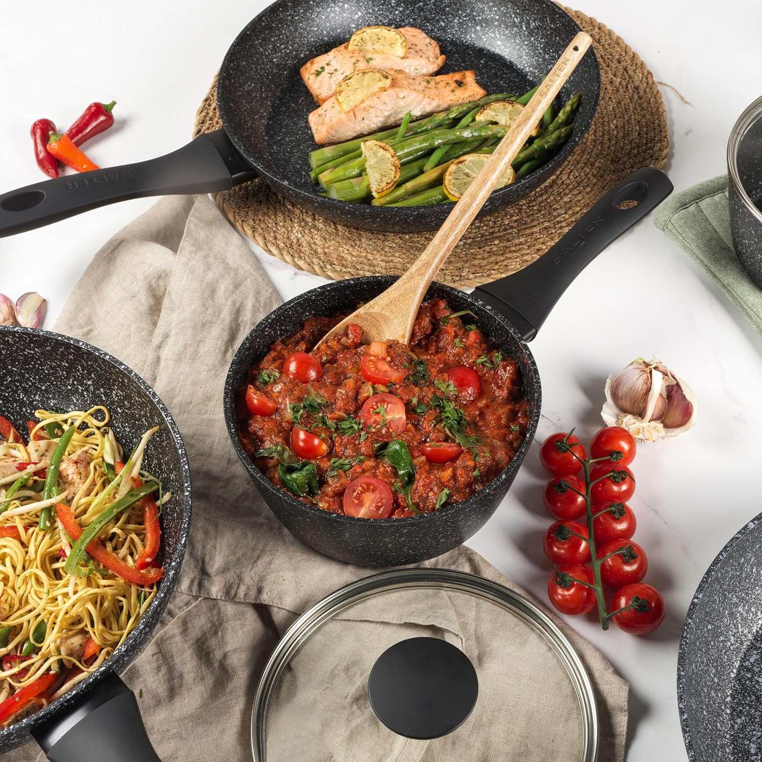 Salter Megastone 3-Piece Pan Set - Non-Stick Cooking Pots, Induction Hob Suitable, 16/18/20 cm Saucepans, Durable Forged Aluminium Cookware, Includes Tempered Glass Lids, Dishwasher Safe