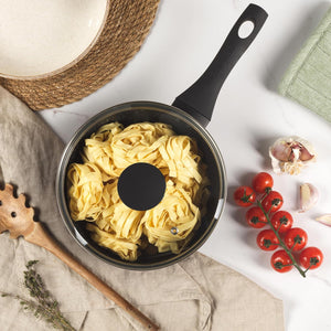 Whether you have gas, electric, induction or ceramic, this Salter Megastone 3-piece saucepan set is compatible with all hob types. Made from PFOA-free forged aluminium, this set includes a 16cm, 18cm and 20cm pan. Each pan has a high-performance coating 10 times tougher than standard non-stick! Each saucepan has a glass lid with a steam vent to lock in essential nutrients and vitamins as you cook. This set is dishwasher safe, can be used with metal utensils and has soft touch stay-cool handles!
