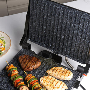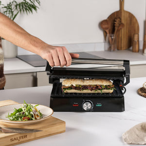Salter Megastone Health Grill – Non-Stick Panini Maker, Plates Open Flat 180°, No Oil Needed, Adjustable Temperature, Power/Ready Lights, Removable Drip Tray, Cool Touch Handles, 2000W