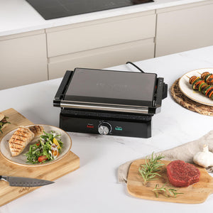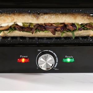 Grill delicious meals with the Salter Megastone Health Grill! The non-stick panini maker is perfect for grilling sandwiches, meat, vegetables and more. The non-stick plates open flat to 180 degrees for double the cooking space! Easily adjust the temperature using the dial for perfect results every time and keep track with the power and ready indicator lights. Use little to no oil when cooking, and the removable drip tray catches excess fat and grease. With cool touch handles for extra safety when cooking.