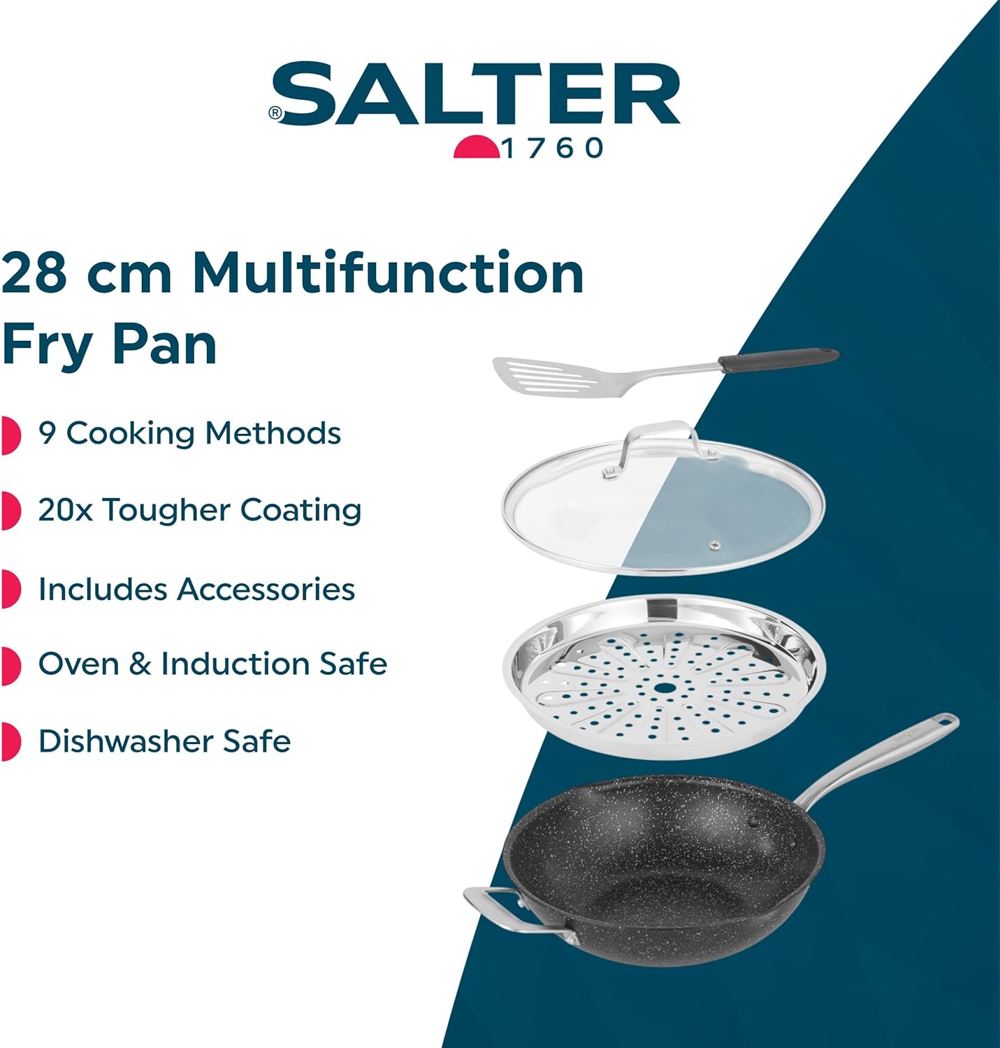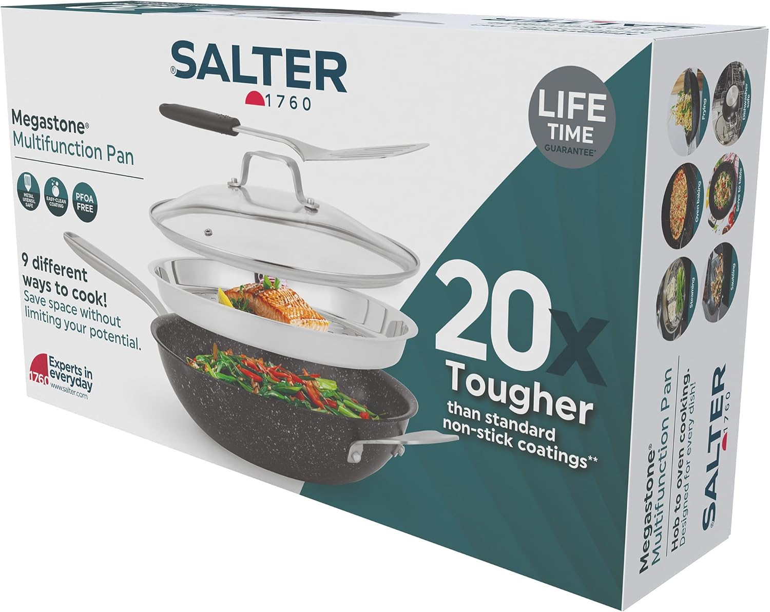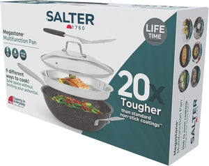 - 9 WAYS TO COOK: Whether you're frying eggs, sautéing vegetables, or simmering a curry, this versatile 28 cm Salter Megastone Multifunctional Pan is built to handle it all!