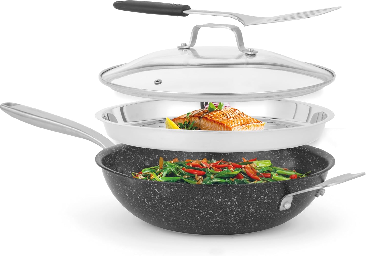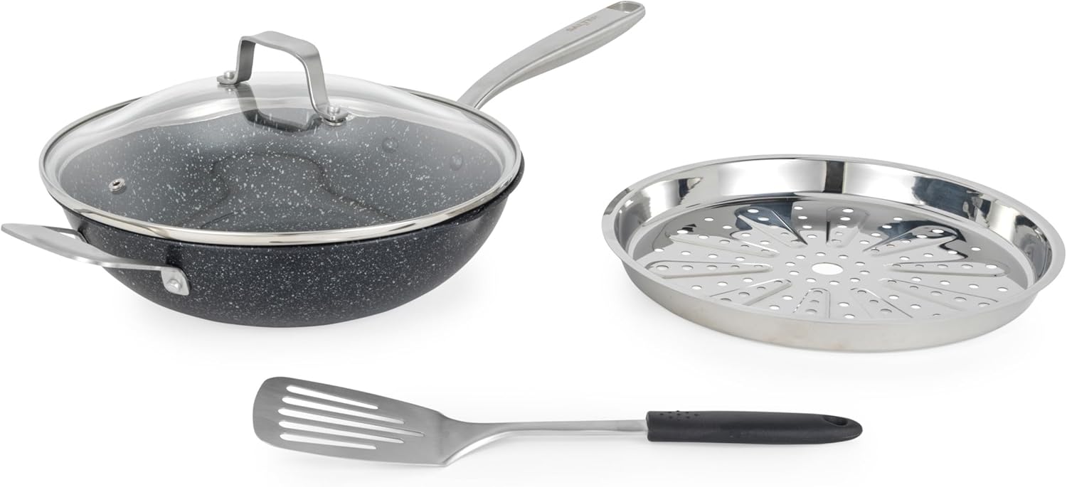 - 3 ACCESSORIES: No need to lift the lid! The included glass lid locks in heat and moisture while letting you monitor your food as it cooks. Thanks to the stainless-steel spatula and steamer, you can create perfectly steamed veg for your roast dinners.
