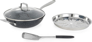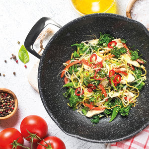 Offering 9 different ways to cook, the Salter Megastone Multifunction Pan is perfect for steaming, frying, baking and more. No need to lift the lid! Including a tempered glass lid and a stainless-steel steamer, you can monitor your food without releasing heat and create perfectly steamed vegetables for your Sunday roast. Both dishwasher and oven safe, this pan is designed for hob to oven cooking and ensures effortless cleaning after use.
