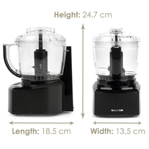 - Measuring 18.5 x 13.5 x 24.7 cm, this compact mini food processor sits comfortably on even the most limited of worktop spaces.