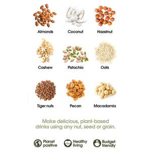 Make delicious, sustainable plant-based drinks in moments using any nut, seed or grain. This BPA free 1.6L vegan nut m!lk maker produces 100% fresh and natural plant milk whilst cutting out the energy, water and waste of plastic cartons. Soak ingredients overnight and blend in the filter basket to make your own chai, milkshakes and lattes with hazelnuts, almonds, oats and cashews. Transform leftover pulp into zero-waste snacks like healthy granola bars, crackers, energy bites and brownies.