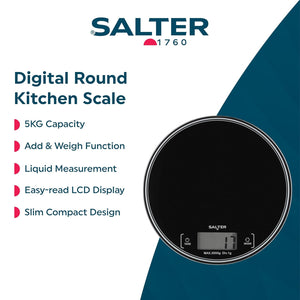 Salter Round Kitchen Scale – Digital Food Weighing Scales for Baking & Cooking, Measures Liquids & Fluids, Easy Read LCD Display, Tare/Zero Function, Slim Compact Design, 5kg Capacity