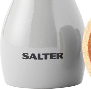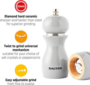 Salter Salt & Pepper Grinder Set - Spice Mills, High Gloss Mechanical Seasoning Pots, Twist To Grind, Adjustable Fine To Coarse, Retro, 26g Salt/13g Pepper, Grey Condiment Set, 14cm
