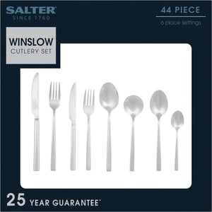 Salter Winslow 44 Piece Cutlery Set - Stainless Steel Silverware, Service for 6 People, Includes Knives, Forks, Teaspoons, Soup Spoons, Serving Spoons and Dessert Cutlery, 25 Year Guarantee