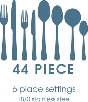 Perfect for complimenting any kitchen or dining room décor, this Winslow 44-Piece cutlery set from Salter allows you to enjoy meals with family and friends for years to come. Designed from high-quality 18/0 stainless steel, this silverware set includes cutlery for a variety of purposes and is dishwasher safe for an easy clean after each use. Including knives, forks, teaspoons, soup spoons, serving spoons and dessert cutlery, this flatware set provides purpose for every course of your meals.
