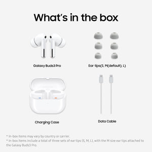 - What's in the box: 1 pair of Samsung Galaxy Buds3 Pro in Grey, charging dock, charging cable, various ear tip sizes and user manual.