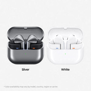 ¹Blade Lights only available on Samsung Galaxy Buds3 Pro. ²Available colours may vary by country or carrier. ³In box items include the Galaxy Buds3 Pro, a charging case, three sets of ear tips for the left and right ear (S, M(default), L), a USB cable and a quick start guide. ⁴Ultra high quality audio up to 24bit/96kHz’ is available on Galaxy S24 series, S23 series, Z Fold6, Z Flip6, Z Fold5, Z Flip5 and Tab S9 series with One UI 6.1.1 or above. Additional devices may be supported in the future. ⁵Adaptive Noise Control is off, Voice Detect is off and Siren Detect is off by default, and can be configured in the Galaxy Wearable app. ⁶The Adaptive Noise Control, Voice Detect and Safety Aware features are only available on Samsung Galaxy Buds3Pro. ⁷Default setting' refers to the original setting for the Galaxy Buds3 Pro when it was first released, simply with the power turned on. ⁸ANC(Active Noise Cancelling) is on by default. ⁹Images simulated for illustrative purposes.¹⁰Specific Blade Light modes can be configured under Settings.¹¹Galaxy Buds3 Pro is the first Galaxy Buds with 2-Way Speaker featuring a planar tweeter and Dual Amp.¹²Interpreter requires Samsung Account login. Certain languages may require language pack download. Service availability may vary by language. Accuracy of results is not guaranteed. Availability and supported features may vary by country, region or carrier. Availability of supported languages may vary.¹³ Audio interpretation is only available when wearing Buds and connected to a Samsung Galaxy smartphone. Interpreter feature is not directly provided by Buds themselves. If Buds are unavailable, the interpreted content is provided on the screen of your Samsung Galaxy smartphone. ¹⁴Images simulated for illustrative purposes. Sequences shortened and simulated. Actual UI may be different.¹⁵Galaxy AI features are supported on Galaxy S24 series, Galaxy S23 series, Galaxy Z Fold5 series, Galaxy Z Flip5 series, Galaxy S23 FE, Galaxy S22 series, Galaxy Z Fold4 series and Galaxy Z Flip4 series as of May 2024. ¹⁶ Devices sold separately. ¹⁷Samsung Galaxy devices may require the latest software update to properly support Galaxy AI features. ¹⁸The default setting of the Pinch and Hold gesture is set to Noise Control. In order to change the Interpreter to Listening Mode, the settings must be configured on the Galaxy Wearable app. ¹⁹ 360 Audio is only available on Samsung Galaxy smartphones and Galaxy Tab devices with Android One UI version 3.1 or later, and selected Samsung TV models. Supported Samsung TV models include: Neo QLED 8K (QN900D, QN800D), Neo QLED 4K (QN95D, QN90D, QN87D, QN85D) OLED (S95D, S90D, S85D), QLED (Q80D, Q70D). Support for 360 Audio and head tracking may vary depending on the application and content. ²⁰Direct Multi-channel is available on Samsung Galaxy smartphones and Galaxy Tab devices with Android One UI version 4.1.1 or later. ²Some content may incur additional charges. Samsung Account log in is required for Samsung Health.