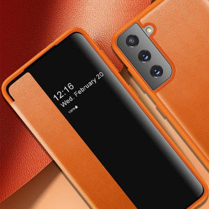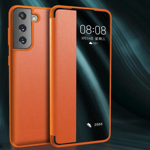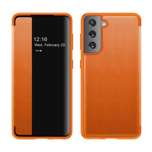 Samsung Galaxy S21 5G Magnetic Side Window View Shockproof Horizontal Flip Leather Case Cover (Orange)