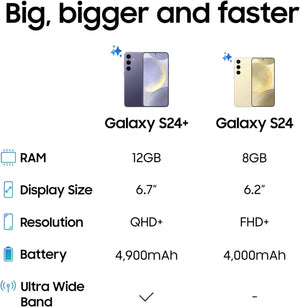 - Two epic options: More to love about Galaxy S24: FHD+ screen resolution for a crisp and clear image, New space-grade Armour Aluminium keeps you protected, IP68 dust and water resistance, Want more? Galaxy S24+ with even larger screen with QHD+⁵ ⁶ ⁷