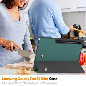 Samsung Galaxy Tab S9 Ultra 3-Fold Pure Color TPU Smart Leather Tablet Case Cover with Pen Slot (Dark Green)