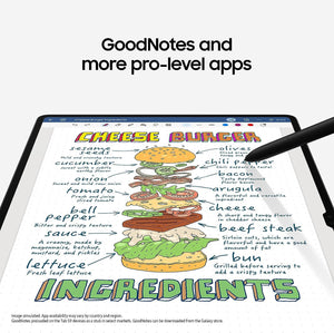 1. Measured diagonally, Galaxy Tab S9 Ultra's screen size is 14.6" (12.4" for Tab S9+ and 11" for Tab S9) in the full rectangle and 14.5" (12.4" for Tab S9+ and 10.9" for Tab S9 respectively) accounting for the rounded corners. Actual viewable area is less due to the rounded corners and the camera hole. 2. Armor Aluminum is cased on the metal rear, excluding Cam Deco, Pen Deco, side keys and the SIM tray. 3. Galaxy Tab S9, S9+ and S9 Ultra are rated as IP68. Based on lab test conditions for submersion in up to 1.5 meters of freshwater for up to 30 minutes. Not advised for beach or pool use. 4. Dust resistance rating is tested under lab conditions by a third party: 2kg of talc powder (max. diameter of 0.05mm) per cubic meter was blown into a test chamber housing the device (air pressure within device kept below surrounding air) for 2 hours." 5. S Pen charging is not supported when Air Command is disabled, unless S Pen is attached to a charging Galaxy Tab S9 series device. 6. The inbox S Pen for the Galaxy Tab S9 series is the first water and dust-resistant S Pen with an IP68 rating. Based on lab test conditions for submersion in up to 1.5 meters of freshwater for up to 30 minutes. Not advised for beach or pool use. 7. Dust resistance rating is tested under lab conditions by a third party: 2kg of talc powder (max. diameter of 0.05mm) per cubic meter was blown into a test chamber housing the device (air pressure within device kept below surrounding air) for 2 hours. Rated IP6X. Dust-resistance may vary by actual usage conditions. 8. Remove any excess water from the S Pen with a dry cloth or towel before using or attaching it. 9. Snapdragon is a product of Qualcomm Technologies Inc. and/or its subsidiaries. 10. Snapdragon is registered by Qualcomm Incorporated." 11. Actual storage availability may vary depending on pre-installed software. 12. 1TB storage option is available only on Galaxy Tab S9 Ultra. 13. Availability of 1TB storage option may vary depending on country, region or carrier." 14. GoodNotes app requires separate download from Galaxy Store and comes with a 1-year full version. Once the full version period ends, an additional purchase is required for continuous use. The terms of service may vary by country and region. 15. Clip Studio Paint app comes pre-installed in select markets. Clip Studio Paint app can be downloaded from the Galaxy Store and comes with a 6-month trial for first-time users. Once the trial period ends, paid subscription to a monthly or annual usage plan is required for continuous use. Terms of service may vary by country and region. 16. LumaFusion app requires separate purchase and download. Terms of service may vary by country and region. 17. Image simulated. Color and model availability may vary depending on country or carrier. 18. Screen image simulated for illustrative purposes. 19. Image simulated for illustrative purposes. Actual UI may be different. 20. Galaxy Tab S9 in Beige comes with a Beige S Pen. 21. GoodNotes app requires separate download from Galaxy Store and comes with a 1-year full version. Once the full version period ends, an additional purchase is required for continuous use. App availability and the terms of service may vary by country and region.
