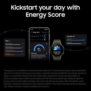 ¹ Energy Score is available on Android phones (Android 11 or above) and requires Samsung Health app (v6.27 or above). Samsung account log-in required. Service availability may vary by country or region. To check the Energy Score, the health data tracked from Samsung Galaxy Watch or Samsung Galaxy Ring must be synchronized with the Samsung Health App. Needs at least the previous day’s activity data and sleep, and heart rate data during sleep. Not intended for use in detection, diagnosis, treatment of any medical condition. The result is for your personal reference only. Please consult a medical professional for advice. ² Requires Samsung Health application version 6.24 or later. ³Galaxy Watch7 must be paired with a Samsung Galaxy smartphone with Android 11. ⁴ Sleep tracking features are intended for general wellness and fitness purposes only. Not intended for use in detection, diagnosis, treatment of any medical condition or sleep disorder. The measurements are for your personal reference only. Please consult a medical professional for advice. ⁵Sleep Coaching requires sleep data of at least 7 days, including 2 days off. ⁶ Race is available for outdoor running and outdoor cycling only. For comparative measurements, it is required to run on the same path as the pre-generated path. User can compare by selecting one of the records up to 14 days ago. ⁷Comparing records through the Race is only available when starting at the same location as the previous record's start point. It will be converted to the running mode automatically, if the starting points are different. ⁸Compatible smartphones and available features may vary by country/region, carrier or device. ⁹Auto detect workouts must be turned on in Settings. Auto detect is not available for all workouts.