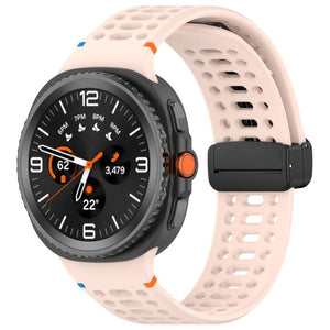 Enhance your Samsung Galaxy Watch8 or Watch8 Classic with this stylish and functional silicone watch band. Designed with a magnetic black buckle, this band offers a secure fit and a modern aesthetic. The soft silicone material ensures comfort during wear, making it perfect for daily use and workouts. Available in an attractive pink color, it's a perfect accessory to personalize your watch.