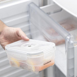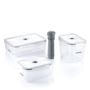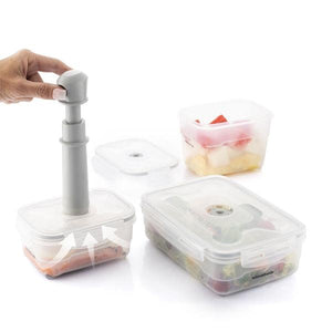 A versatile set of 3 containers for vacuum packing of different sizes and capacities, perfect for keeping food fresher for longer, with all of its flavour and nutrients. In addition, they are extremely useful for speeding up the marinating process of some foods. They have a lid with a vacuum valve and 4 hermetic, anti-drip and anti-spill closure tabs. Includes a manual vacuum pump to vacuum pack foods easily, improving and prolonging the optimum preservation by up to 3 times. You simply need to position the vacuum pump on the valve of the lid, exerting pressure on it and moving the pump’s plunger up and down until all of the air has been removed from inside the container. The vacuum is released by pressing the valve on the lid. These original multipurpose and multifunction food containers are suitable for the fridge and freezer, enabling you to organise foods and make the most of space. They are also microwave safe, so you can heat food and for fast and low fat cooking. They can be cleaned easily in the dishwasher. Ideal for all types of foods (meat, fish, cold meats, vegetables, biscuits, snacks, soups, salads, etc.). If desired, they can also be used to carry food, like a conventional lunchbox.