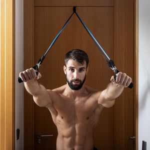 A set of 5 adjustable resistance bands in various colours (according to their intensity level) which includes an exercise guide, carry bag and accessories to perform a multitude of exercises for the arms, shoulders, chest, glutes, legs, etc. The elastic bands can be used together or separately, they have foam handles and metal carabiners for optimum grip and hold. Thanks to their portable design and carry bag, they can be easily used anywhere.