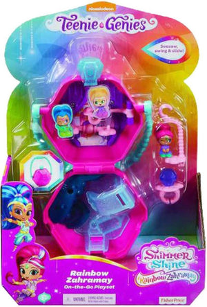 Sail through the rainbow waterfall into magical rainbow Zahra may a hidden world of new genie friends mermaids flower sprites and more shaped like a genie gem this case opens to reveal a teenie genies rainbow Zahra may playset Inside kids will find lots of fun features including a swing slide and seesaw The playset features a convenient carry handle and also comes with a cloud ring that a genie can peg onto so kids can take their genies wherever they go