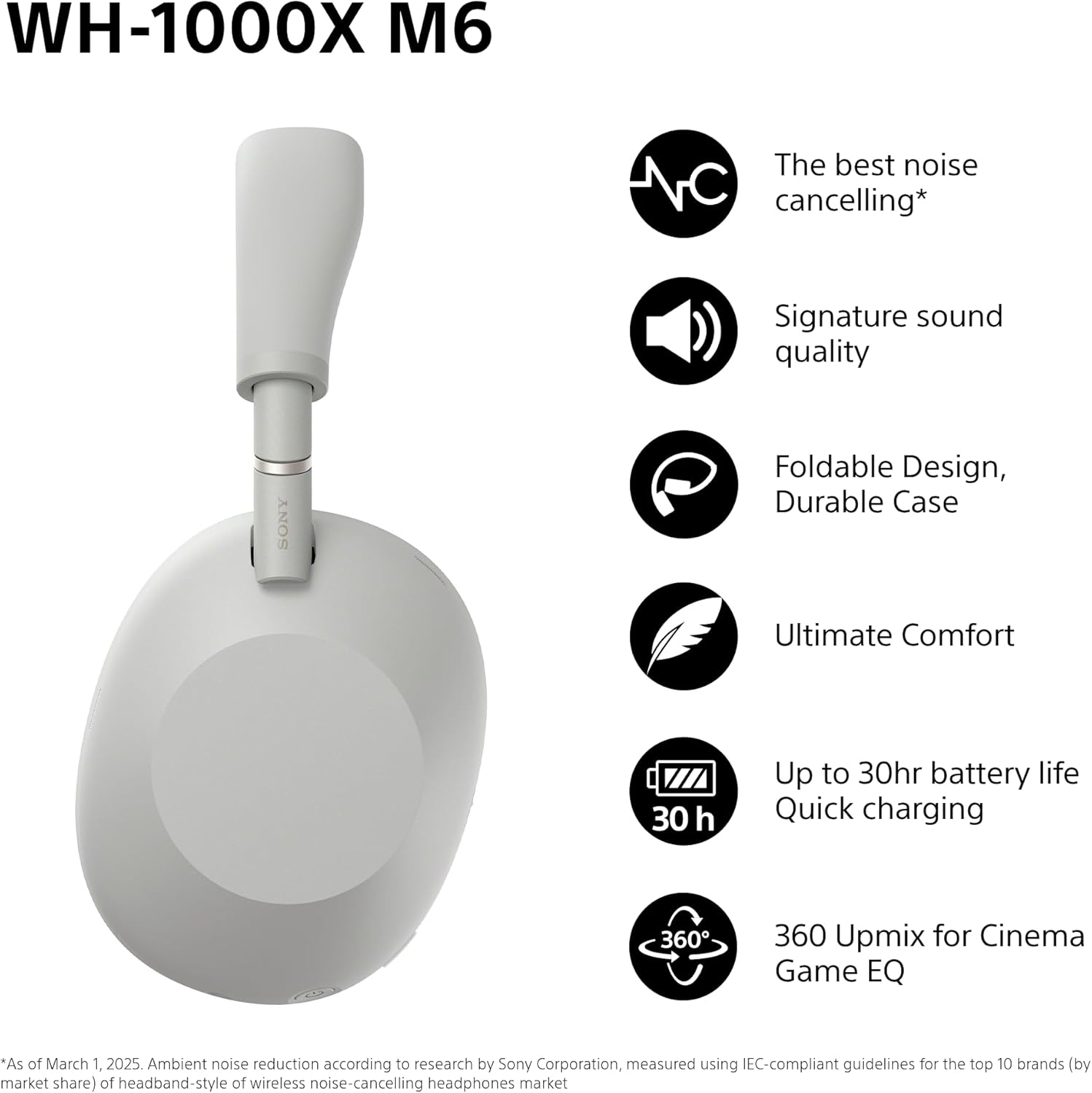 Sony WH-1000XM6 Flagship Noise Cancelling Over-Ear Wireless Bluetooth Headphones, Signature Hi-Res Sound, Ultimate Comfort, Foldable Design, Durable Case, 30 HR Battery, iOS & Android - Silver