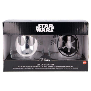 Elegant set of 2 glasses in rounded shape with practical format and decorated with some of the most famous licenses. Made of high quality borosilicate glass.Features:- Capacity 510 ml.- BPA free- Metallic effect