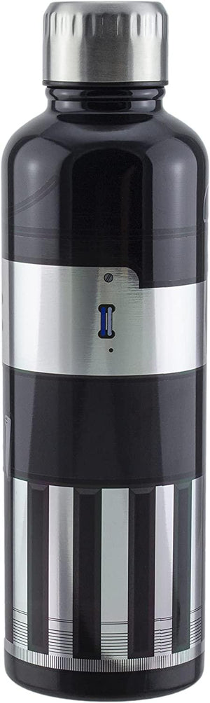 The 500ml (16 fl oz) highly detailed black and silver stainless steel water bottle is designed to resemble the cylindrical hilt of Darth Vader's lightsaber. The reusable bottle comes with a screw-top lid so you can keep it in your bag without worrying about spills or leaks.