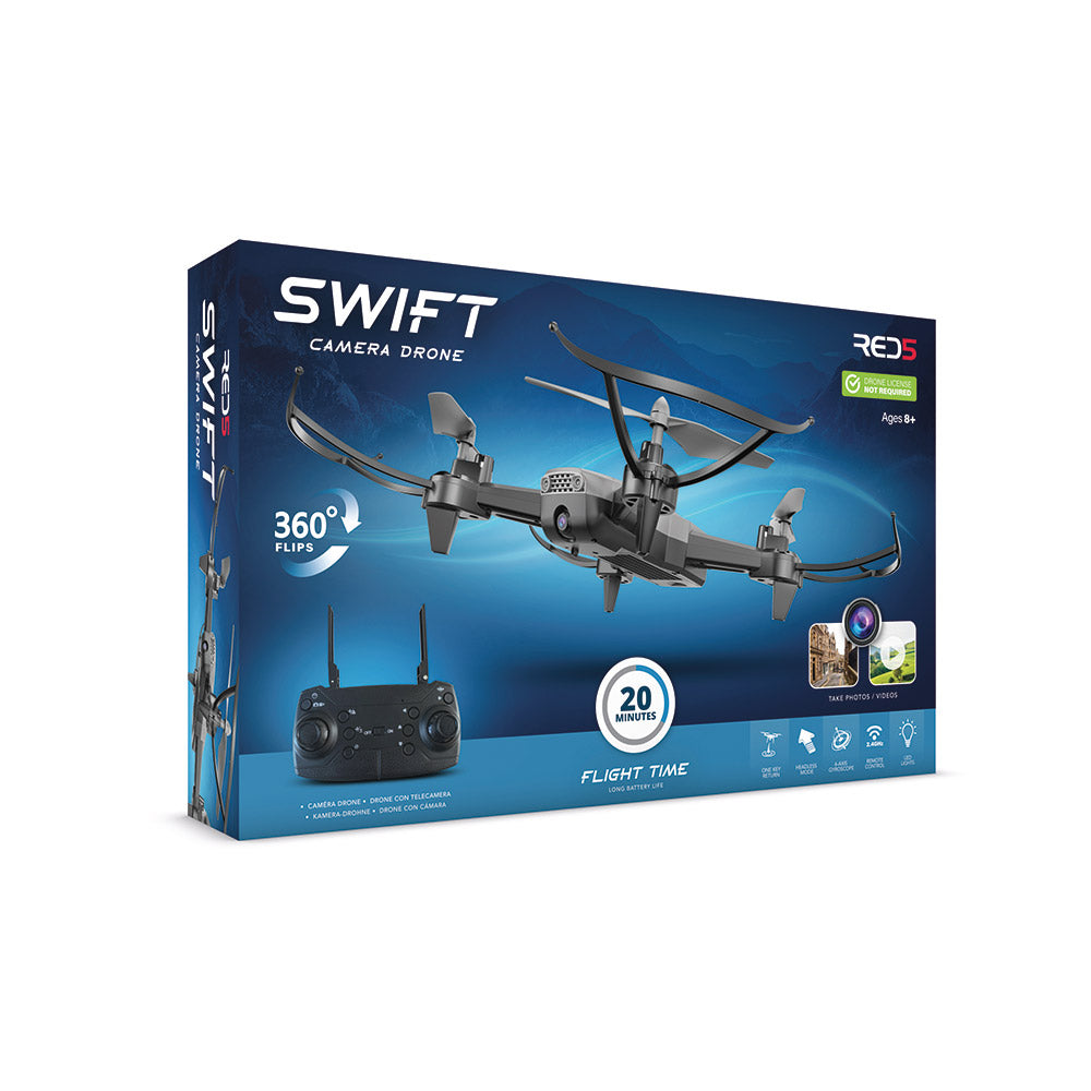 Introducing the RED5 Swift Drone with First-Person View! Enjoy precise control up to 30 meters and capture stunning real-time footage with its HD camera. PTSI compliant for ages 12+, it includes extra privacy protection for secure flying. This drone makes a fantastic gift for enthusiasts and measures approximately 31 cm x 6.7 cm x 31 cm, making it easy to handle. Get ready for exciting aerial adventures and immersive flying experiences with the RED5 Swift Drone!