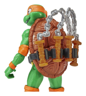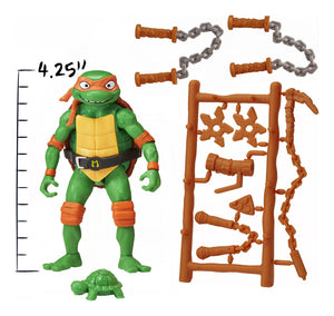 - ACCESSORIES: Mikey comes ready for battle with his iconic nunchaku, a separate weapons rack loaded with lots of different accessories, and a baby turtle