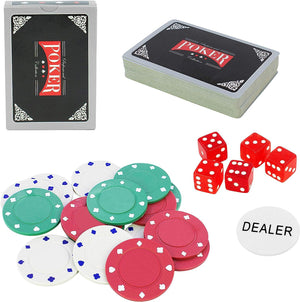 - WHAT DOES IT INCLUDE? The Texas Hold'em set comes with 2 x Decks of Cards, 1 x Dealer Button, 100 Poker Chips and 5 Dice.
