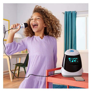 Be a star with the Tobi™ 2 Interactive Karaoke Machine! Sing-along, karaoke, free-play, and dance to a lightshow with the 8 built-in songs and beats. Connect to your own, external music devices and play any song through wireless Bluetooth® technology. The built-in speaker is part of the show. Reduce the volume of the vocals to let your own voice shine through. Plus, pitch correction enhances your singing and keeps you in tune. Grab the corded mic and rock out! Use different voice effects and add silly sounds. End the performance with a round of applause.