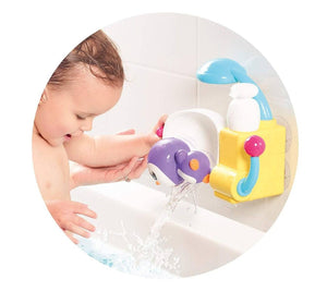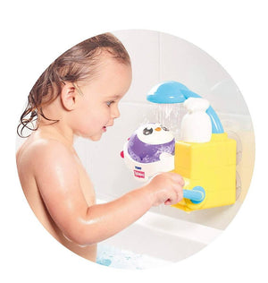 After a long day making ice cream, Peryn likes nothing better than a long bath and a refreshing shower! Use the shampoo bottle to pour in water + bubble bath and pull the handle to make wash him. Pour in just water, pull the handle and the shower will rinse Peryn in the bath. When Peryn is finished, turn the side wheel and flip him out and into the bath!