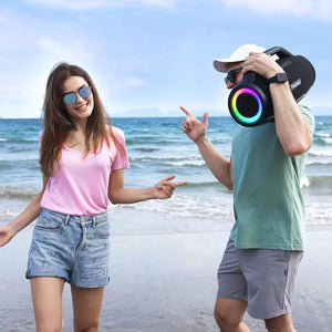 The Tronsmart Bang Max is a big Bluetooth speaker that weighs just shy of 6kg and boasts 130W of dynamic power. It is a three-way speaker, comprising two 30W woofers, two 20W “mid-tweeters”, two 10W tweeters, and two passive bass radiators. You also get custom EQ and RGB lights to tweak your party vibe both sonically and visually (with three different lighting modes) accessible via a control app. The Bang Max is IPX6 water-resistant, perfect for pool parties!