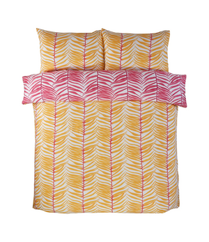 Bring a tropical vibe to your bedroom with this vibrant duvet cover. Featuring a striking palm leaf design in sunny yellow and bold pink, it adds a splash of color and a touch of exotic flair. The crisp white background enhances the bright pattern, creating a fresh and lively look. Soft and comfortable, this duvet cover is perfect for a stylish and relaxing sleep.