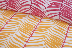 Bring a tropical vibe to your bedroom with this vibrant duvet cover. Featuring a striking palm leaf design in sunny yellow and bold pink, it adds a splash of color and a touch of exotic flair. The crisp white background enhances the bright pattern, creating a fresh and lively look. Soft and comfortable, this duvet cover is perfect for a stylish and relaxing sleep.
