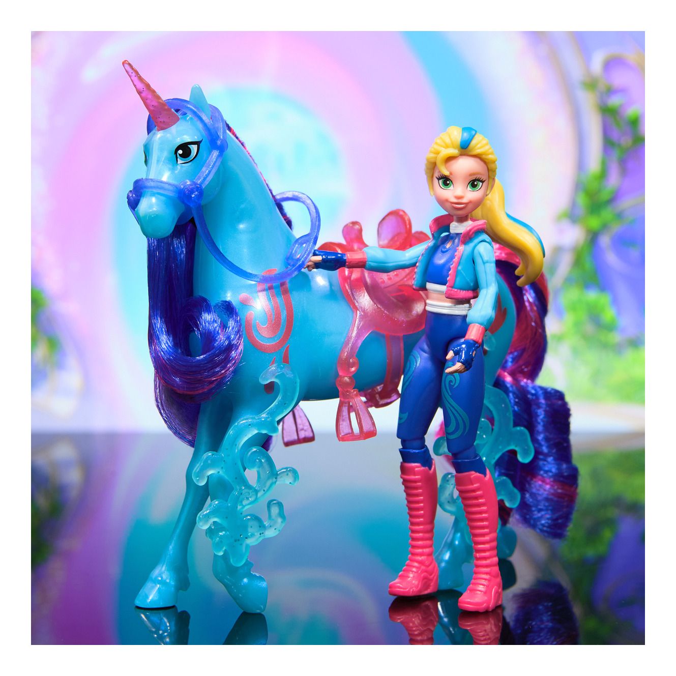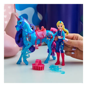 • River 13-cm unicorn toy and doll accessories: River's details include metallic Water Magic markings, 2 translucent clip-on power accessories, a brush, plus a translucent removable saddle and bridle for added play
