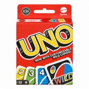 UNO is the classic card game of matching colors and numbers that is easy to pick up…impossible to put down and now comes with customizable Wild Cards for added excitement! Players take turns racing to get rid of all their cards by matching a card in their hand with the current card shown on top of the deck either by color or number. Special Action cards deliver game-changing moments and help defeat opponents! Use the Swap Hands card to change hands with any other opponent and write your own rules using the 3 customizable (and erasable) Wild Cards! You'll find 19 of each color (red, green, blue, and yellow), plus 8 Draw Two, Reverse and Skip cards in every color, along with 4 Wild Cards, 4 Wild Draw Four cards, 1 Wild Swap Hands Card and 3 Wild Customizable cards. If you can't make a match, you must draw from the central pile! Don't forget to shout “UNO” when you only have one card remaining! The player to rid themselves of all the cards in their hand scores points for any cards their opponents are left holding. The first player to reach 500 points wins. Get Wild 4 UNO! Includes 112 cards and instructions. Each sold separately, subject to availability. Colors and decorations may vary.