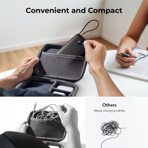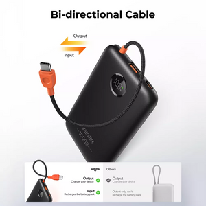 The built-in USB-C cable that tucks neatly into the housing for safe storage and instant use. The integrated cable supports bi-directional charging so the same connector charges both your device and the Powerbank without additional leads. The design is intended for everyday convenience and fewer items to carry.