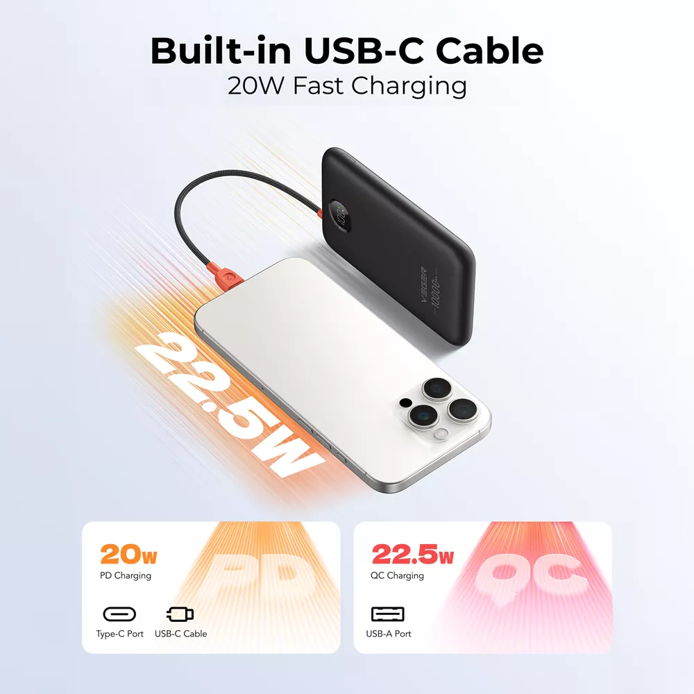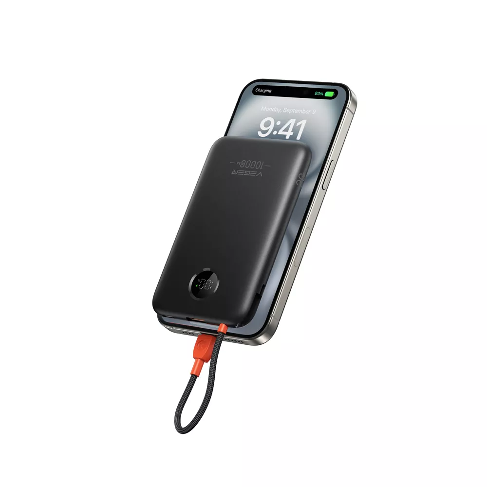 The VEGER K1C is an ultra-slim 10,000mAh Powerbank with an integrated USB-C cable, a clear LED display, and high-speed PD charging designed for modern USB-C devices. It combines convenience and performance in a compact, travel-ready package that removes the need to carry extra cables while delivering fast, reliable power on the move.