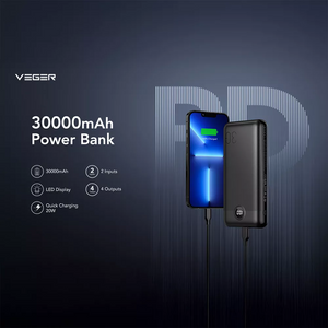 The VEGER L30 is a high-capacity 30,000mAh power bank in a sleek black finish, engineered to keep multiple devices powered through long trips, business travel, and heavy daily use. With a digital LED display, versatile port set, and 20W fast charging, the L30 balances raw capacity with intelligent charging convenience.
