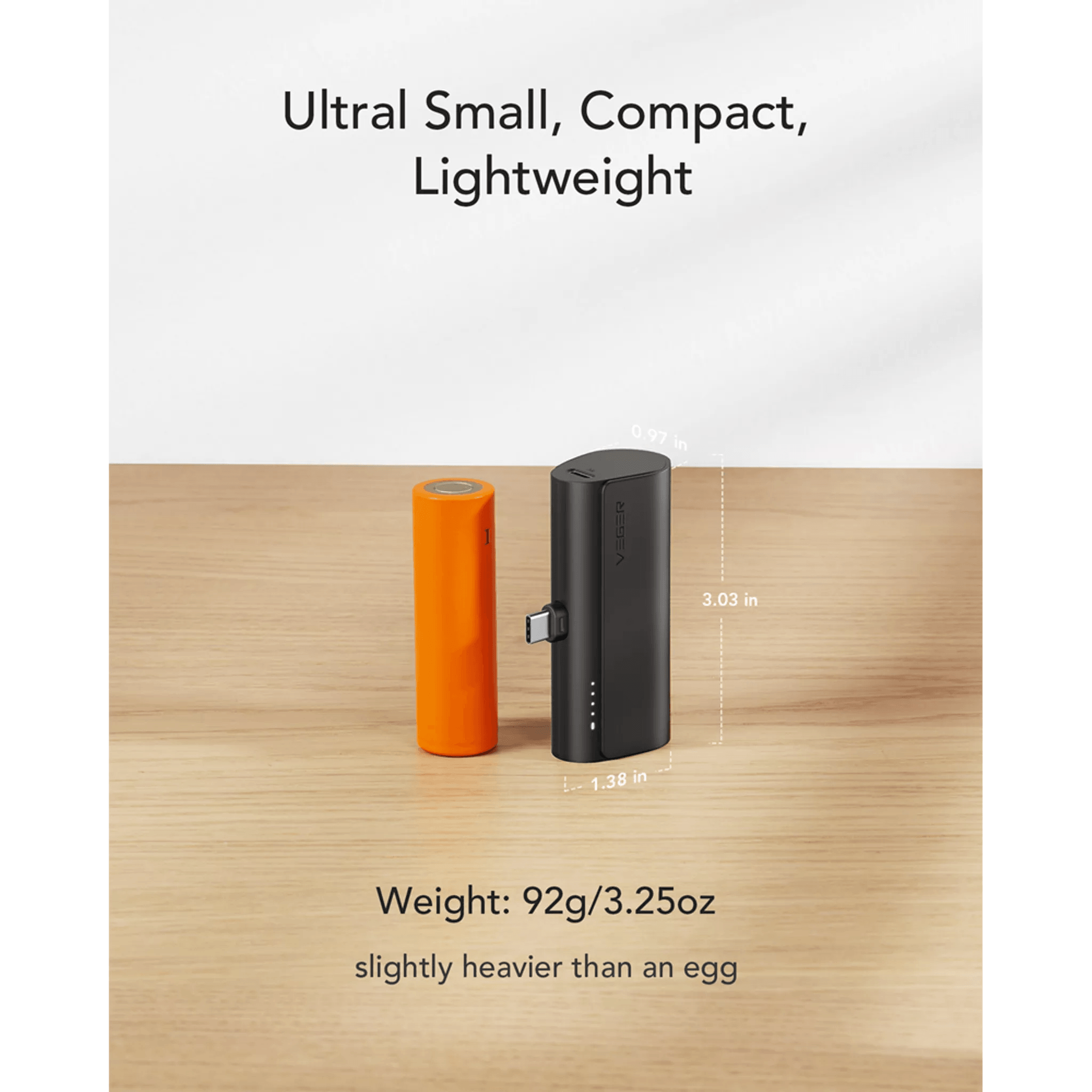 With a 5,000mAh capacity, the Veger PlugON-C remains ultra-compact. Weighing only 92g and measuring 3.03" in length, it easily fits into your purse or pocket without adding any extra burden. Perfect for meeting your daily charging needs on the go.