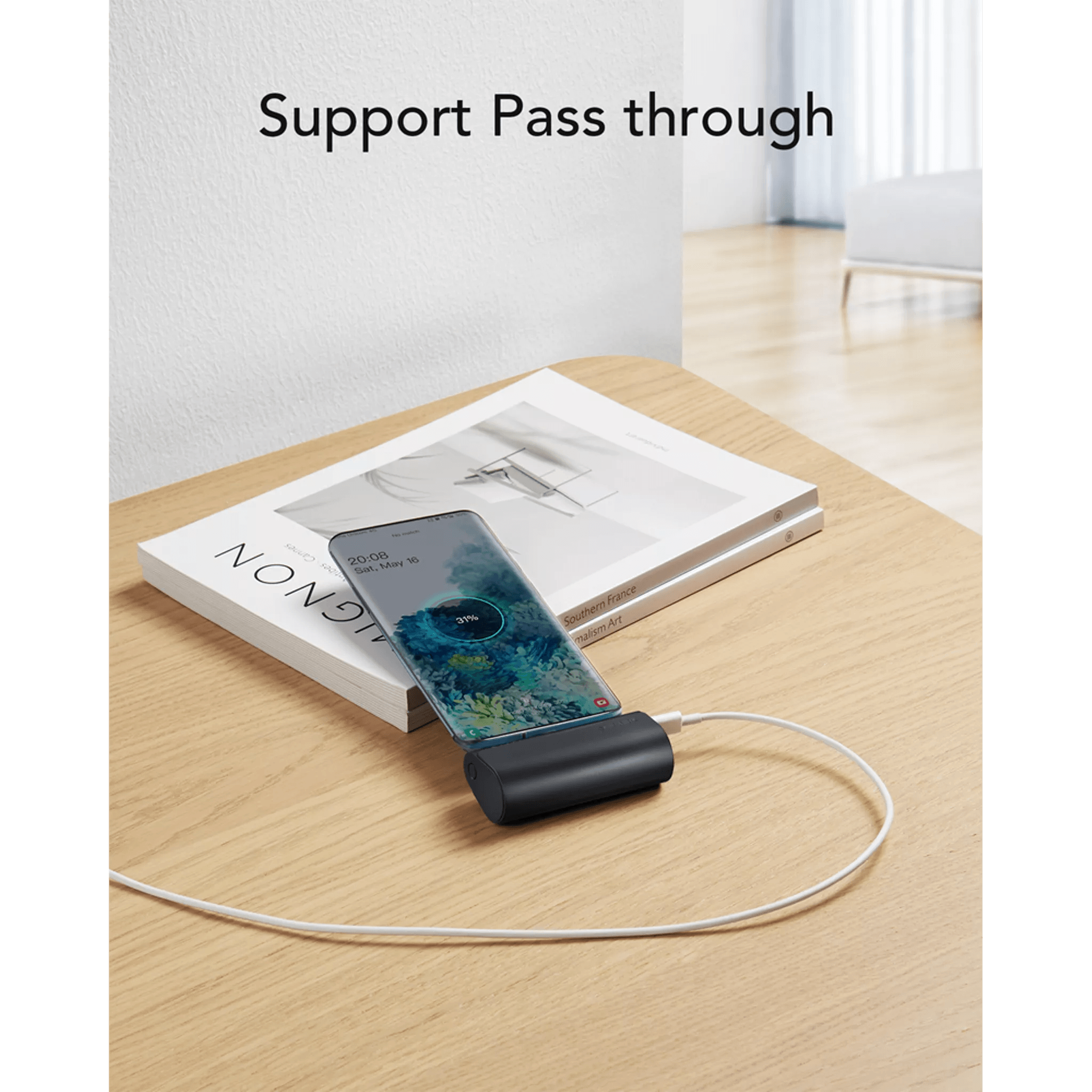 The battery pack supports pass-through charging, allowing you to charge your smartphones while recharging the power bank itself.